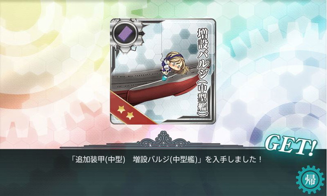あと、デイリー任務の装備開発ですが、これまで艦載機を中心に開発を続けて来ましたが、烈風も彩雲も全空母に回る程度には数が揃ったので、有り余る鋼材を多く消費する開発にバトンタッチ。とりあえず機関・バルジの開発に着手し、早速中型バルジを入手しましたが・・・装甲が上がる反面、回避が下がるので何とも使い難いかも。まぁ図鑑埋めのコレクターズアイテムですかね。