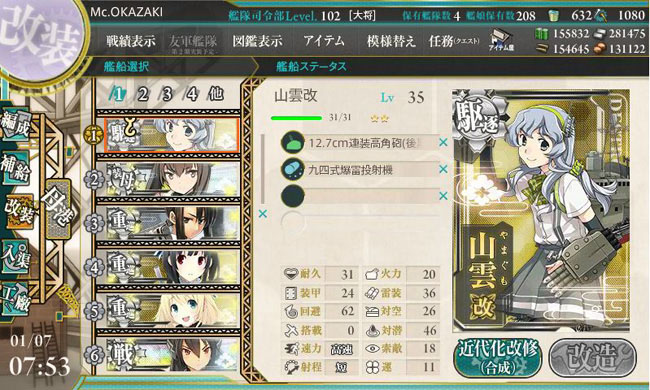 さて、年末に入手した新実装艦の山雲も無事に改造レベル(Lv.35)に達して改造完了。パッと見、何も変わってないように見えますが、開いていた口が閉じたり、髪飾りに13号電探が装備されたりと何気にマイナーチェンジされてたり。