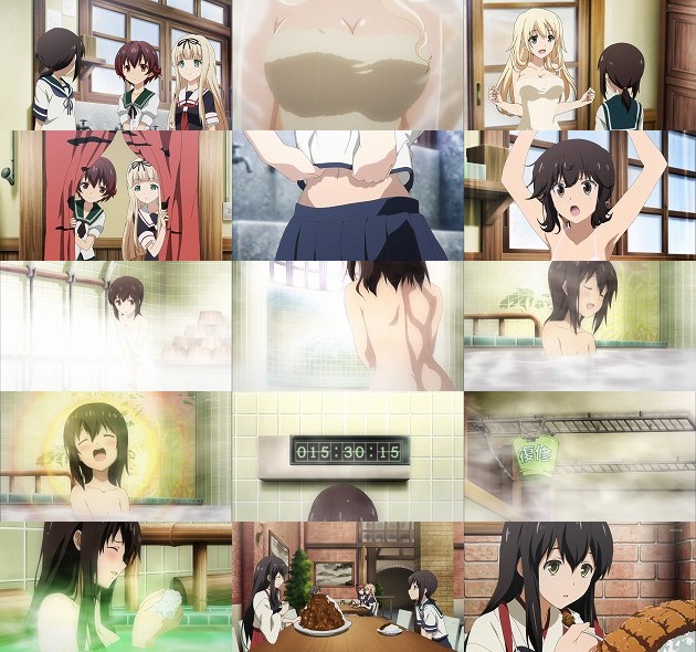 なかなか技量が上がらない吹雪は、憧れの赤城先輩の指導を仰ごうと鎮守府内を探し、加賀の助言で入渠所(=風呂)に向かいますが、そこで遭遇したのは艦これ随一のふとm・・・グラマラスボディの持ち主の愛宕。うん、アニメ版ではウェストが細くなって良かったね! 愛宕に脱がされて入渠所に放り込まれた吹雪は、そこでようやく赤城に会えますが・・・先日の戦闘で被弾した赤城は修復中。その時間、何と残り15時間半!・・・艦これやってると分かりますが、高レベルの大型艦の入渠の場合、これくらいがデフォなんですよねー。 優しい提督によって高速修復材(バケツ)を貰った赤城は瞬時に回復。お風呂上がりの食事風景(後ろに白露と村雨が見えますね)で、遂に赤城の大食い設定が暴露w・・・まぁ実際は加賀の方が大食らい(悪燃費)ですし、それでも大和級に比べれば可愛いもの・・・なんですけどね。