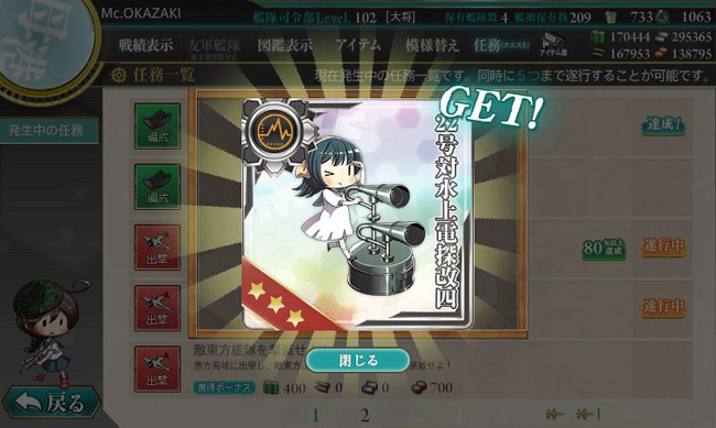 そして妙高改二を第1艦隊の旗艦に据えるという編成任務をこなすと、この22号水上電探改四が入手出来ます。こちらは22号水上電探の上位互換で、命中+8はプリンツ・オイゲン改が持って来るスーパー電探のFuMO25(命中+10)に次ぐもの。普段の演習時は勿論、イベント時や厄介な任務の遂行時にはぜひ装備したいアイテムです。