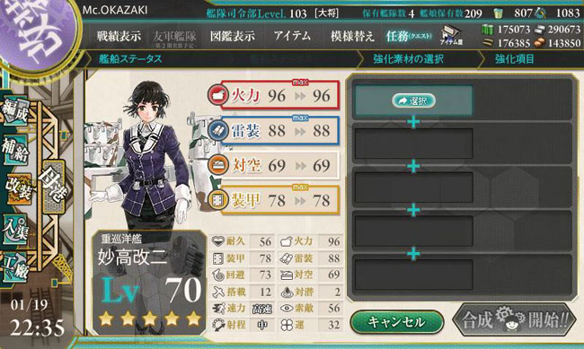 20.3cm砲×2、21号電探、零式三座水偵の標準装備搭載の上で、対空以外をMAXまで上げるとこんな感じ。羽黒・足柄と比べると火力がやや低いものの、その分雷装が高め。総合能力は勿論最強重巡の一角です。