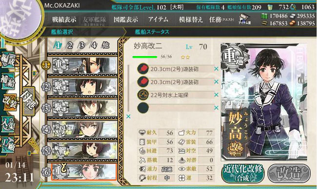 Lv.70という高いレベルを要求される妙高の改二は、2号砲×2と22号水上電探を持って来てくれます。まぁ22号水上電探とかさほど珍しい装備でもないのですが・・・