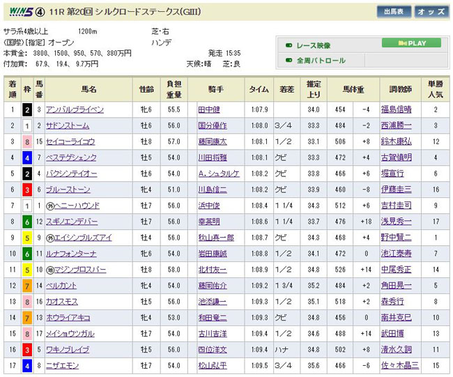 続いてはディープインパクト産駒の上がり馬のベステゲシェンク。54kgの軽ハンデと川田騎手の存在も恐いです。後はサクラバクシンオーの血とシュタルケ騎手の腕と2枠4番の好枠でバクシンテイオー、鞍上の岩田騎手が恐いルナフォンターナ、平坦の1200m戦ならそのスピードが復活しそうなホウライアキコ、そしてなぜかこの日異常なまでの勝率を誇ったキングカメハメハ産駒であるというだけの理由で13番人気のメイショウツガルも押さえておきます。