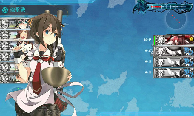 E-1海域に進出して、対潜掃討作戦を開始する我が第1艦隊・・・改二となった各駆逐艦に最新対潜装備を積みまくり、更にプリンツ・オイゲン改や妙高改二から拝借した高性能電探を装備しての対潜作戦は圧倒的な効果を発揮し、5戦して大破撤退ゼロのストレートで海域突破です。つーかやっぱりその格好で戦うのね時雨さんw