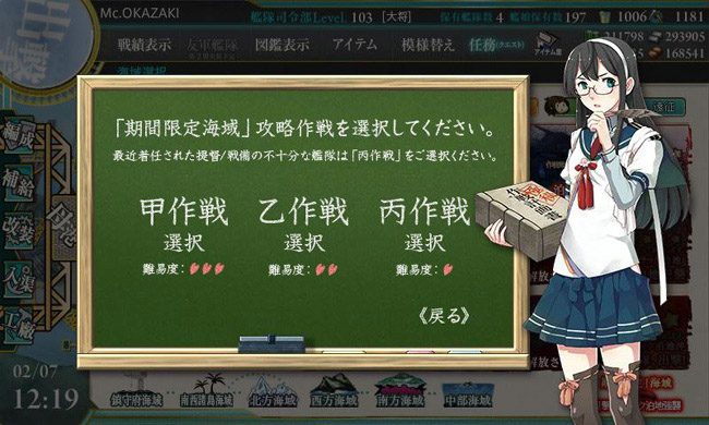 自分のように始めてから9ヶ月という微妙なポジションの提督はその中間の乙作戦が最良なのかもしれませんが・・・この9ヶ月、半端無くやり込んで来た自信があるので、ここは基本「甲作戦」をチョイスして行きます。