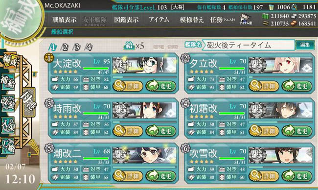 なので実質今回の冬イベのスタートは本日土曜日の昼(それまでにデイリー任務を消化)。対潜作戦のE-1海域に向けて出港準備を整える我が第1艦隊の顔触れ・・・秋イベ以降、頑張って駆逐艦の改二化を進めたおかげでこのような駆逐艦改二艦隊が組めるまでになりました。