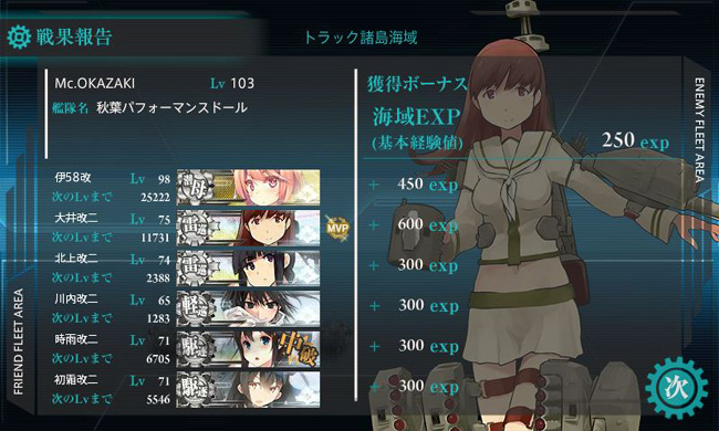 3・4・5回目の出撃は道中大破撤退を強いられ、さすがに最終決戦の厳しさを感じさせます。それでも6回目の出撃で再びボスに到達し、那珂の連撃でS勝利をもぎ取る!・・・ドロップは鈴谷。磯風(ry
