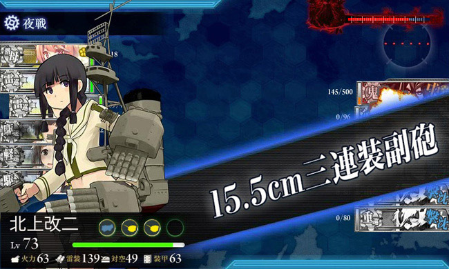 しかも昼戦はT字有利!その上、敵の攻撃は役目を終えた烈風キャリアの大鳳に集中(しかも当たらない!これもキラ付け効果か)。夜戦までにボス以外の全ての敵艦を葬り、ボスのHPも80程度で夜戦突入し、これは完勝モード!