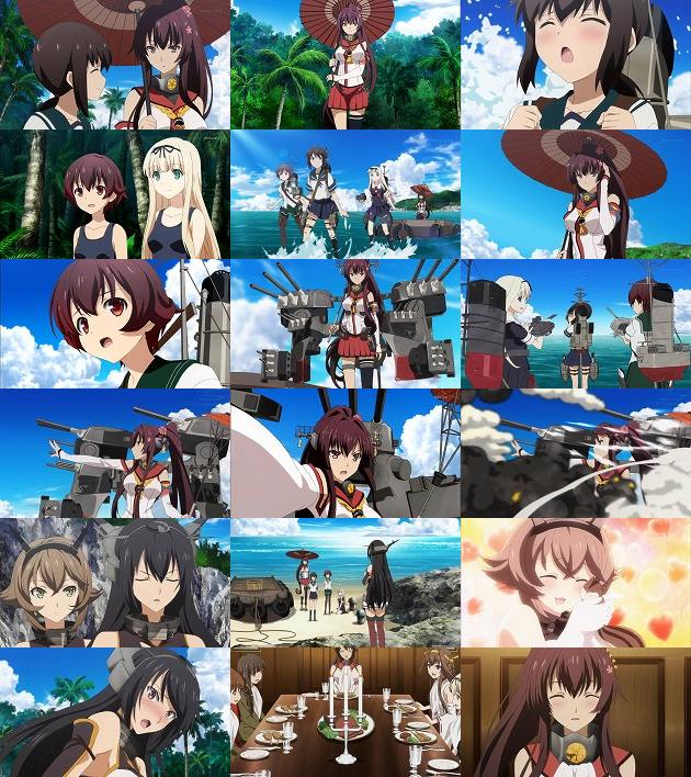 吹雪は大和をいかだに乗せて沖に出る事を提案。これなら艤装を装備しないで海に出られる・・・という訳ですが、秘匿するという目的からはやっぱダメだろこれ。しかも2,000dの特型駆逐艦が最大排水量72,000dの大和を乗せたいかだを引くのは無理があり過ぎ・・・そこに夕立と睦月が協力を申し出て、ようやく大和の外海処女航海の夢が叶います。 しかし楽しい航海も束の間、他の艦隊が撃ち漏らした敵機がトラック島海域に侵入。駆逐艦の小口径砲では対応出来ない高度を飛ぶ敵機に対し、大和は対空三式弾による主砲斉射を敢行。これを一撃で葬るものの、その轟音は当然島の長門たちの知る所となり・・・しかし長門はこの件に関してお咎め無しの裁定を下すのでした。そんな長門を「甘いでちゅねー♪」と評する陸奥・・・やっぱ聴かれてたw 戦いの後の豪華な食事に再び「大和ホテル」を絶賛する金剛ですが、そんな金剛に「もうホテルじゃない」事を微笑みながら告げる大和。あぁ、そういえば大和の初陣もミッドウェイ海戦だったっけな。 そして次回は夕立が改二になるっぽい?