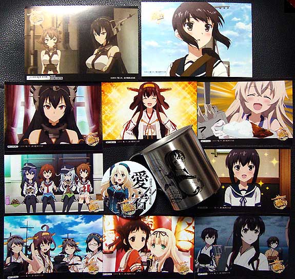 まずはポストカードが2種、艦これグッズ1,000円につき1枚貰える生写真(なので8枚)、写真にはありませんが吹雪と睦月の店頭告知用短冊ポスター各1枚、ランダム渡しになる大型缶バッジ(愛宕でした・・・まぁ俺的には当たりの部類です)、そして早期予約特典だった明石×大淀が描かれたステンレス製マグカップです。