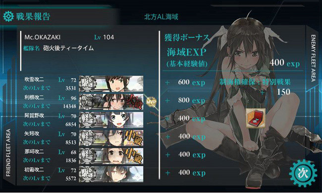 今日の昼間(仕事中)は、大和・矢矧・雪風・浜風・初霜・朝霜で放置していました(冬月・涼月は未実装、霞は遠征中、磯風は知らない子)。何人か演習で挑んでくれたみたいです。