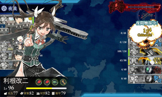 続いて2-5。ここはいつもの妙高型4隻と利根型2隻の改二巡洋艦6隻による攻略です。スクショはラストダンスの夜戦、足柄・羽黒・筑摩が大破し戦闘続行不能、敵は戦艦3隻が残った状態。戦闘可能だった那智と妙高がそれぞれ敵艦を1隻ずつスナイプし、最後に残った利根がクリティカルで敵旗艦を撃沈するという、まさに映画化決定な瞬間です。