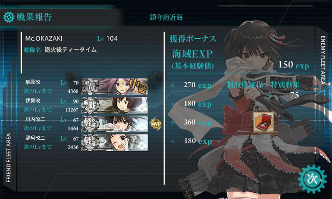 さて今月のEO海域、まずは1-5。春イベに向けて川内級の底上げを兼ねての攻略を行っています。隼鷹もとっとと改二(Lv.80)にしたい所です。