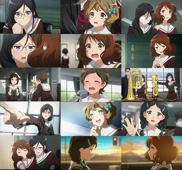コントラバスの経験があって本人も希望している上に、現在演者がいないという理由で緑輝のコントラバスは即決。吹奏楽経験の無い葉月はフラフラ彷徨った挙句、たまたまチューバのマウスピースを買ってしまった事もあってあすか副部長推奨のチューバ担当へ。中学時代にユーフォニアムを担当していた久美子は、他の楽器を希望していたものの、旧知の先輩である葵にユーフォニアム経験者である事を暴露されてしまい、あすかと同じユーフォニアム担当へ・・・つーかこのあすか先輩、第1話から大好き過ぎるw