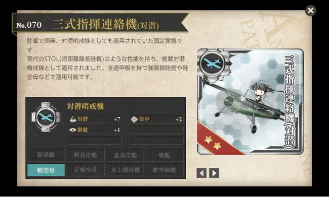 あきつ丸改が持って来る激レア装備その2が三式指揮連絡機(対潜)。似たような機体をドイツのロンメル将軍も愛用し、戦場で神出鬼没の活躍を見せたのは有名な話。こちらは対潜哨戒機として運用され、対潜+7はカ号観測機には劣るものの、命中+2があるので甲乙付け難い所です。