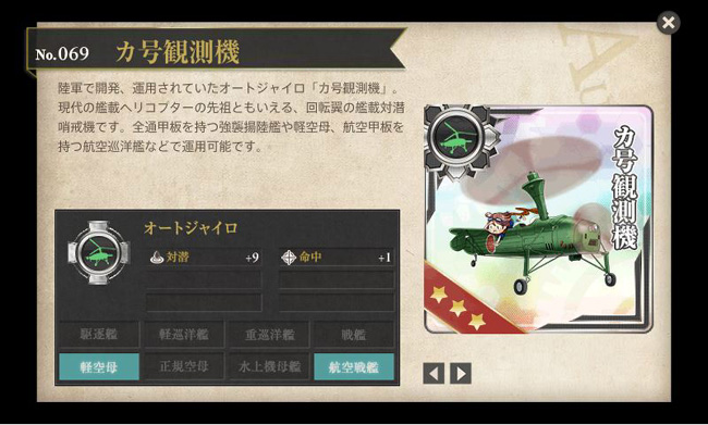 改装する事によってようやく艦載機運用能力を持つあきつ丸。初期装備の三式指揮連絡機(対潜)とカ号観測機はここでしか入手出来ない激レア装備です。