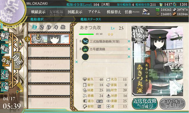 改装後のあきつ丸自体の能力は・・・お察し(-_-; 耐久と装甲が若干マシってレベルで、その他はどれも壊滅的。こりゃ育成にはまだまだ手が掛かるなぁ。