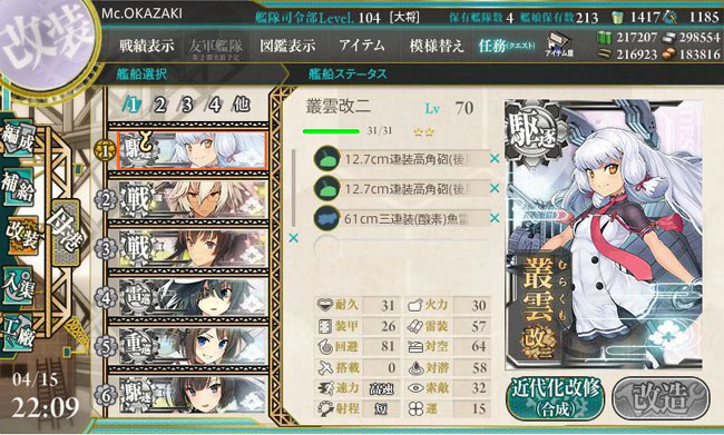 まずは叢雲改二。実装までにレベリングが間に合わなかったですが、ようやくLv.70に達して改二となりました。何とか春イベには間に合った感じです。