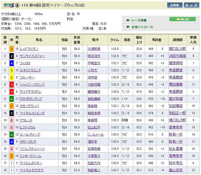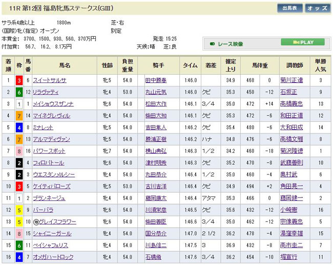 まさかの2→1→3番人気決着・・・不安を抱えた人気上位馬がしっかりと結果を出し、期待のフロレットアレ−は直線でバテて10着大敗。タイムも平凡でしたし、ここからの新星はあまり期待出来ないかな・・・。