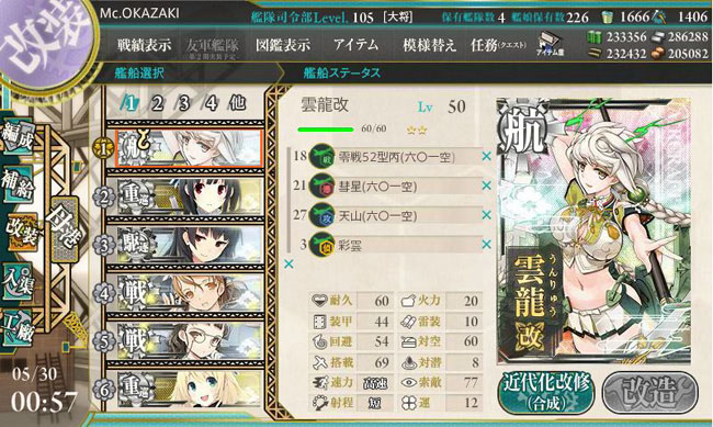 そして雲龍も第一次改装。こちらもLv.50とかなり高いレベルを要求されます。グラフィックは大きく様変わり・・・胸の大きさは相変わらずです。