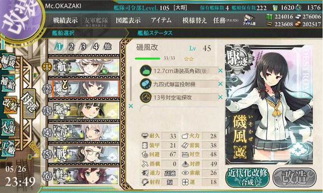 さて、今週は春イベで入手した駆逐艦磯風がようやく第一次改装を迎えています。駆逐艦では最も改装レベルが高いLv.45での改装ですから時間が掛かりました。グラフィック的には胸のリボンの形状の変化が一番大きいですかね。