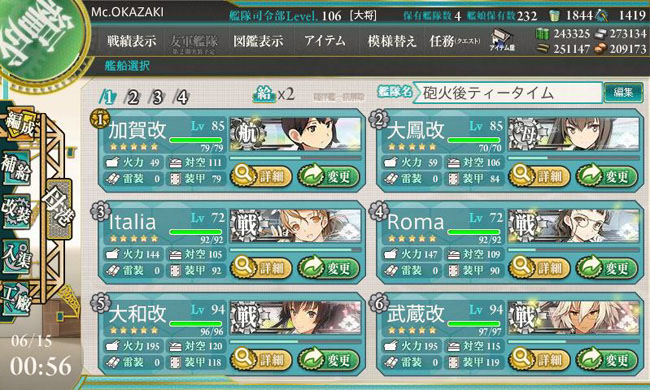 当初は加賀・扶桑・イタリア・ローマ・大和・武蔵での突破を狙ったものの、制空値が足りず連撃や弾着が取れないので、結局最後は加賀と大鳳に烈風601と烈風で5マス、彗星江草と彗星601で2マス、彩雲を1マス装備し、戦艦部隊は主砲×2+観測機+三式弾を装備しました。やっぱこの組み合わせが一番効果的みたいです。