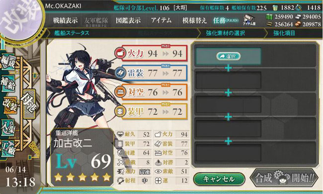 まずは改二が実装された重巡加古。姉妹艦の古鷹の改二がLv.65、準姉妹艦の衣笠の改二がLv.55だったので、既にLv.69だった加古は慢心して改二を待ち(あ、一応Lv.70にすぐ上げられるようにはしてました)、無事に改二を迎えられました。ちなみに古鷹同様、Lv.65で改装が可能だったようです。