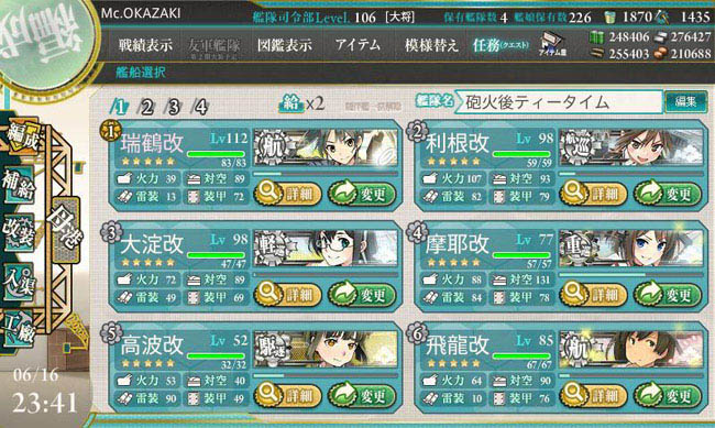 高速戦艦×4、正規空母×2の下ルートでしばらくやってたんですが、異常な程に1戦後に羅針盤に弾かれるようになったので、妙高型4隻+利根型2隻の今の上ルートに落ち着きました。