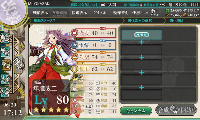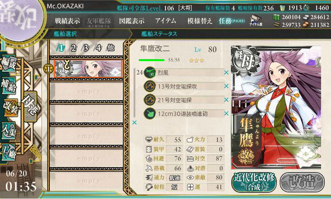 あ、一応姉妹艦の飛鷹も併せてLv.80にしてますので、いつでも改二どんと来いって感じです!