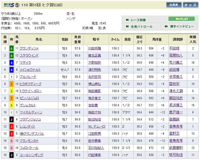 やっぱ難しいわこのレース・・・3回目の騎乗でようやく馬を手の中に入れた川田のグランデッツァが快勝。2着は最近長距離戦ばかりを使われて来たステラウインドがこの距離で快走。そして3着に最低人気のマデイラとか・・・上位は笹の葉カラーと夜空の色に彩られて、短冊の願い事は三連単100万馬券の、まさに七夕記念でしたとさ!(自棄