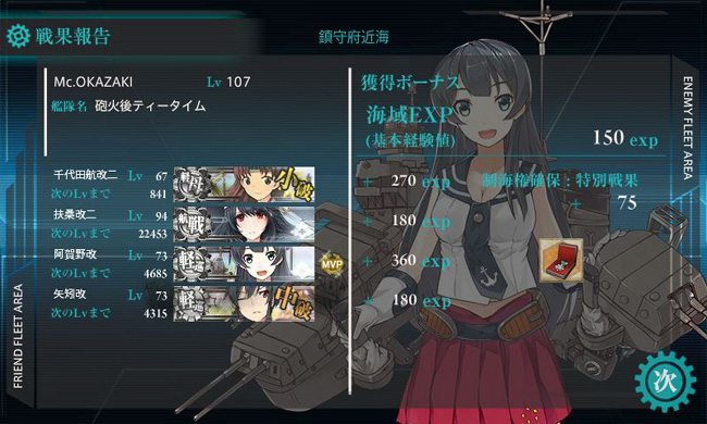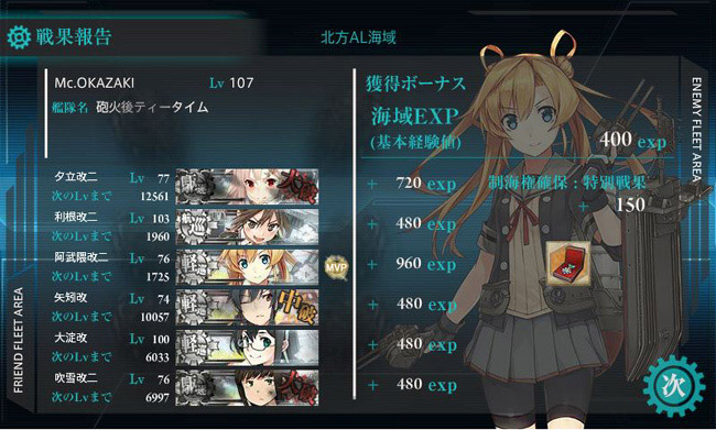 今月の3-5の締めは矢矧が中破しながらも決めてくれました。金曜日のアプデで阿賀野型は微妙に能力値上がりましたからね。これで改二が来たら重巡なんて目じゃなくなるかも!?