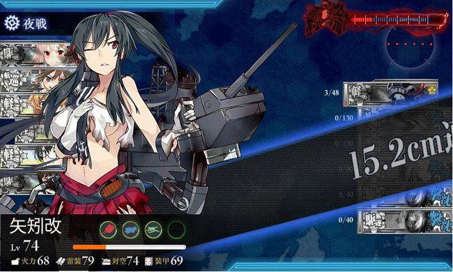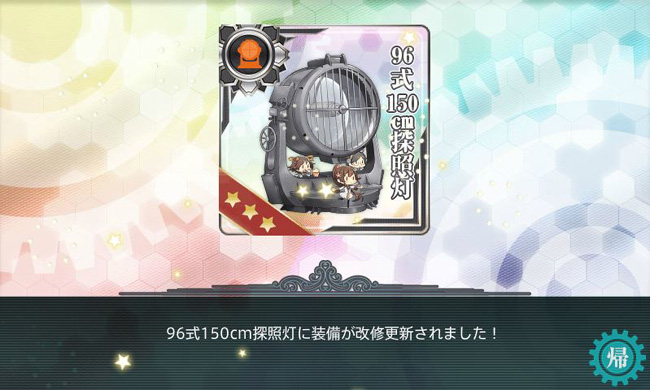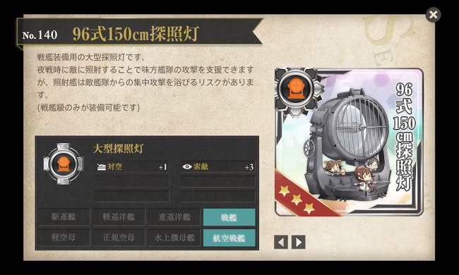 装備出来るのは戦艦クラスのみ。と言っても性能は通常の探照灯と大きな差がある訳でもなく・・・完全に装備図鑑を埋めるためだけに作りましたw 夏イベで戦艦が夜戦に参加するような場面があったら、装備してみるのも良いかも・・・でも基本、主砲+主砲+徹甲弾(三式弾)+偵察機ですよね、戦艦は。