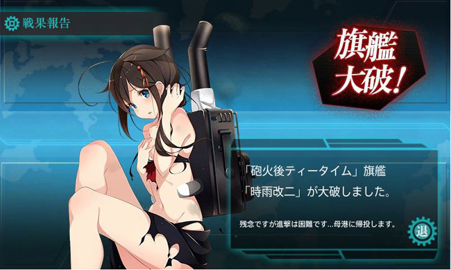 しかしさすがに一筋縄では行かないこの海域。途中、旗艦の時雨がスナイプされて道中撤退を強いられる事も・・・水着でバカンス気分で出撃するからこんな事になるんだよ!どれ、水着が破れたところをよく見せてごらん・・・ぐへへ(鬼畜)