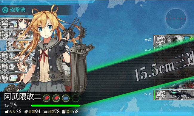 そして今月一番楽しみにしていたのが3-5。何しろ阿武隈改二の実装で、水雷戦隊任務が劇的にこなしやすくなりましたからね。 ルートはやはり準下ルート。航巡1・軽巡3・駆逐艦2の編成は替えず、軽巡枠の中に阿武隈を組み込みます。 早速大活躍する阿武隈!開幕雷撃で1隻、昼戦の連撃で1隻、そして夜戦のカットインで1隻をたいらげるその活躍っぷりは、まさに北方海域の女神です!