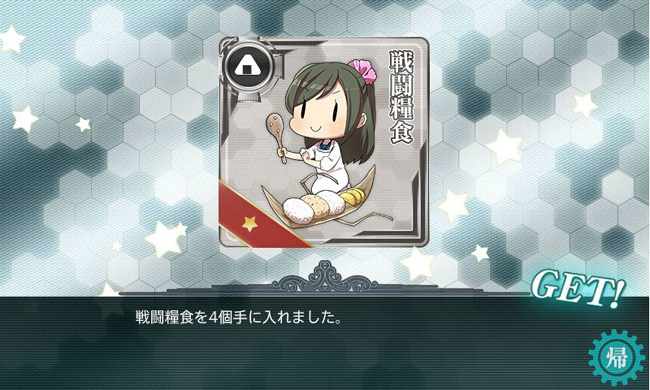 新アイテムの戦闘糧食は作戦中に発動して、搭載艦とその周辺の艦をキラ付けしてくれるみたいです・・・が、まだ使ってないのでその効果の程は不明です。 尚、比叡でこれを装備改修すると深海棲艦を一撃で倒す強力な武器になる模様・・・(ぇ