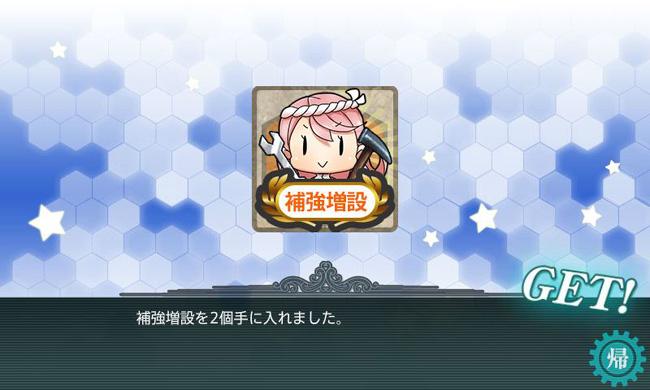 甲作戦の突破報酬は特注家具職人、給糧艦「伊良湖」、そして新装備の補強増設×2、戦闘糧食×4。今回から新実装の補強増設は、ダメコンや後述の戦闘糧食を装備出来るスロットを増設出来るアイテム。これでダメコンのために装備枠を削る事がなくなります。