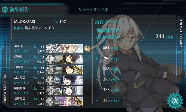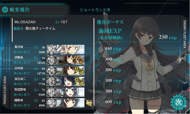 まずは順当に初戦突破。まぁこの辺はチュートリアルみたいなもんですしね。 しかし・・・次に菊月を実戦で使うのはいつになる事やらw