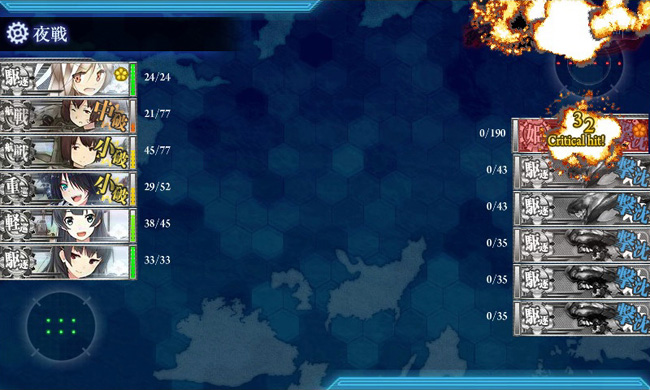 この海域の最大のポイントは、艦隊に空母を入れず、且つ駆逐艦菊月を艦隊に編入する事によって、なんと道中1戦のみでボスマスに到達出来る事。制空権は航空戦艦や航空巡洋艦でも取れるので、編成は縛りのある軽巡1隻と駆逐艦2隻のうち駆逐艦は菊月を編入し、残りの自由枠は航空戦艦2隻、重巡1隻が盤石となります。勿論相手は駆逐艦隊なので強力な扶桑型航空戦艦や妙高型重巡を用いる必要はなく、戦艦では最弱の伊勢型航空戦艦と、重巡では最弱の古鷹型で十分な戦果を挙げられます。