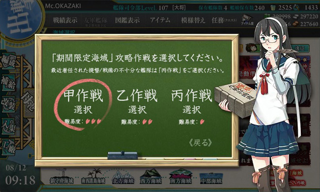 作戦レベルは勿論甲を選択。こんな序盤で乙以下を選ぶ程、ウチの鎮守府はヌルくありません。目標は甲での完走ですから!