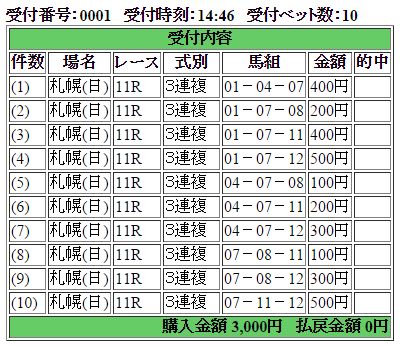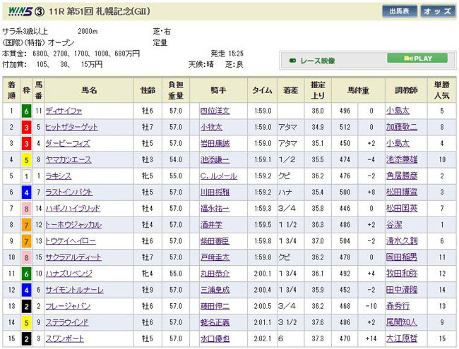 地味なベテラン洋芝巧者のディサイファが重賞3勝目!そして毎度毎度人気薄で突っ込んで来るヒットザターゲットが2着、函館記念を制したダービーフィズは鞍上岩田が重賞6連勝を狙うも3着まで・・・あれ?GT馬2頭はどこへ行った??