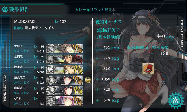 最後に霧島がスナイプされましたが、バケツの消費も5個以内で済んでます。戦艦3隻が迎え撃つボス戦も、制空権さえ取れれば重巡部隊でもS勝利は容易いのがこの海域。弾着観測射撃が連続で発生する爽快感が毎月たまりません♪