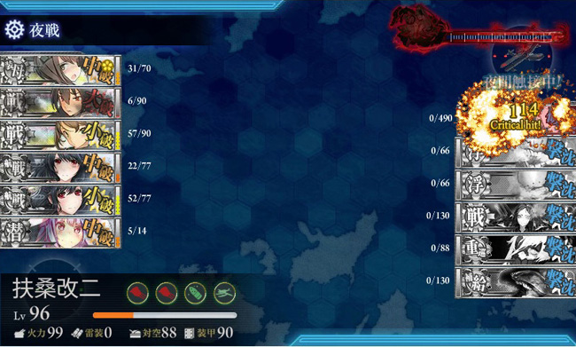 それでも何とか削りを終え、これまた難関のボスゲージ破壊へ。最終編成は正規空母1・航空戦艦2・戦艦2・デコイ潜水艦1。装備はあれこれ悩んだ挙句、