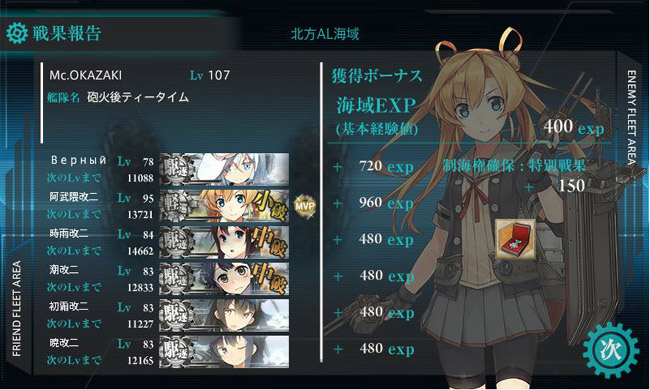 それでもゲージ破壊時にはほっぽちゃんマスはかなり厳しい編成になるので、途中から南ルートに変更して阿武隈改二による水雷戦隊という新たな鉄板編成で今月も無事攻略完了。ボスマスでの天津風ドロップは今月もありませんでしたが・・・夏イベでようやく入手出来たので先月までのガッカリ感は完全になくなりました。