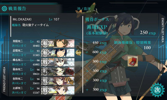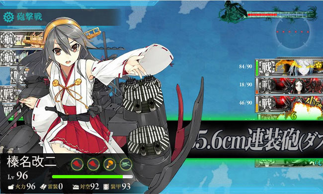 続いて2-5。ここはまず妙高型4隻+鈴谷&熊野で第5戦隊任務を消化し、その後は突破力に定評がある金剛型高速戦艦4隻+正規空母2隻(今月は飛龍+蒼龍)でゲージ破壊まで。途中2回ほど羅針盤に嫌われたものの、やはりこの編成が鉄板ですね。
