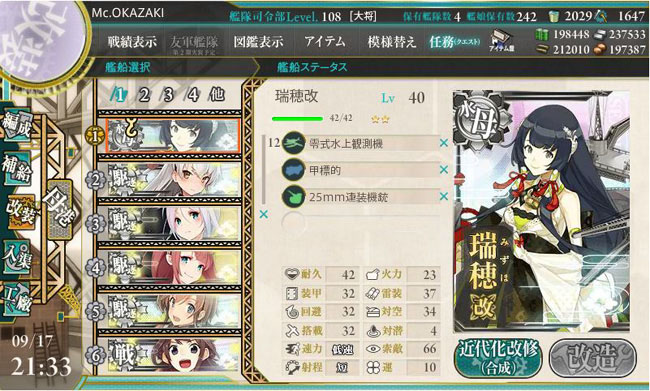あと、夏イベの新艦娘では最後に瑞穂が改造を終えました。Lv.40と要求されるレベルが少し高めですし、能力的にあまり上げ難い艦娘ですしね。