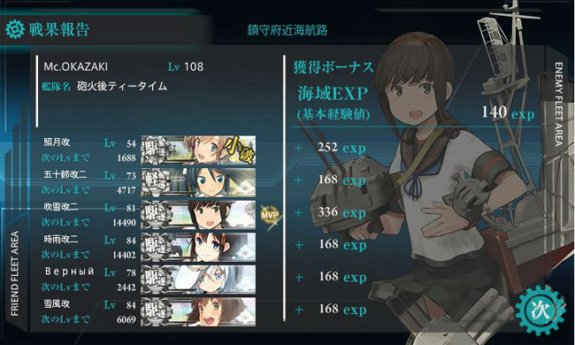 7度の巡回が必要なマップなので、赤疲労に陥った秋月を途中交代させたものの、殆ど大きなダメージを受けずに今月も海域突破。これで一通り今月のEO海域を終えたので、後は備蓄を主に、夏イベでの運用で同型艦内でのレベル差が出てしまった艦娘を、3-2-1巡回でレベルバランスの調整を取る事が今月のタスクですかね。えぇ、同型艦でレベル揃ってないの気持ち悪い人なんでw