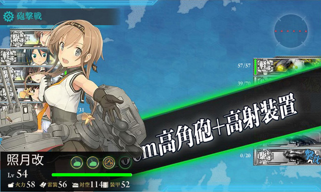 EO海域で唯一残っていた1-6をクリアしています。水雷戦隊による船団護衛が主任務のこの海域、対潜→対空→対艦戦が続く中、一番厄介なのがFマスの対空戦。しかし今月からは新たに防空駆逐艦の照月が加わった事で戦局は一変!防空巡洋艦五十鈴・防空駆逐艦秋月・防空駆逐艦照月の揃い踏みによる初撃の対空カットインで、殆どの敵機を叩き落としてくれます。