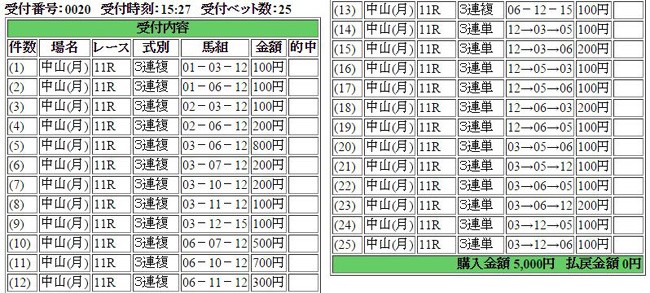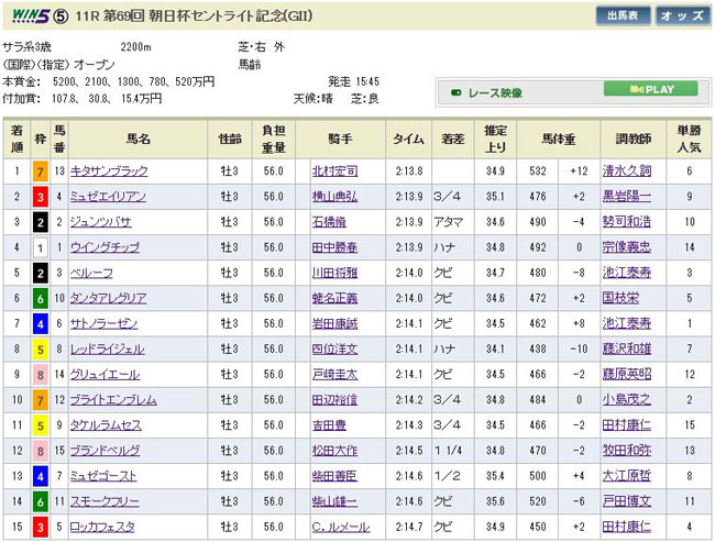 距離不安も何のその、スプリングS1着→皐月賞3着と何気に中山巧者だったキタサンブラックが先行抜け出しで人気馬に出番を与えない快勝。2着に逃げ粘ったミュゼエイリアンと、行った行ったの競馬。そして狙った穴馬のジュンツバサとウイングチップが3-4着と好走するも、ベルーフ5着・サトノラーゼン7着・ブライトエンブレム10着と人気馬が総崩れで三連単は61万円の大波乱・・・おーい、池江泰寿調教師、井崎脩五郎、息してるかーw