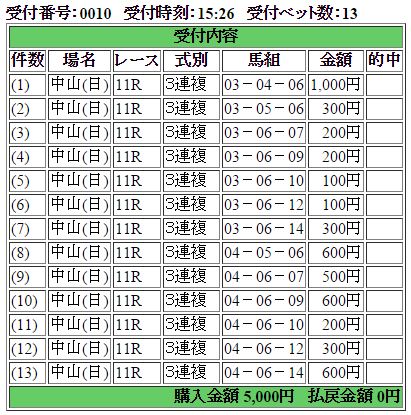 馬券はロゴタイプ1頭軸の三連複。相手は当然ショウナンパンドラとヌーヴォレコルト中心ですが、中山コースの達人である田辺騎手鞍上の10番人気メイショウカドマツや、中山コース【4・1・0・0】と相性抜群の7番人気ミトラ辺りにも手を伸ばします。