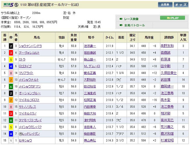 な、なぜだー!!!中山コース×ミルコ・デムーロなら絶対だったはずのロゴタイプが最後の最後にミトラのチョイ差しに屈してまさかの4着!そして牝馬頂上決戦は外からの豪脚一閃でショウナンパンドラが粘るヌーヴォレコルトをあっさりかわしてライバル対決を制す!やっぱ池添騎手の差しは本当に巧いです。